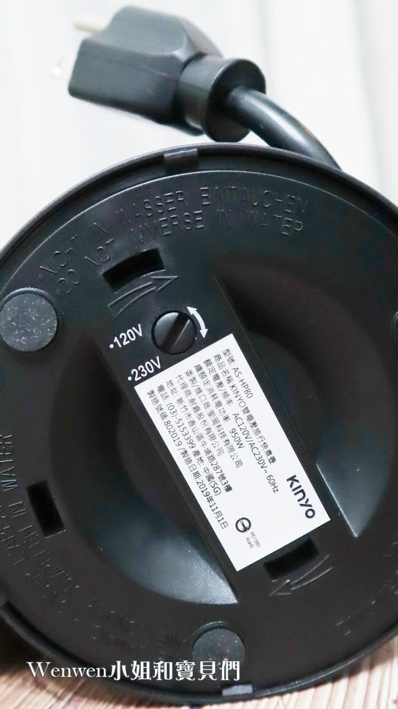 KINYO雙電壓旅行快煮壺,在底部有止滑設計,國際雙電壓切換,以及電線收納的旋鈕